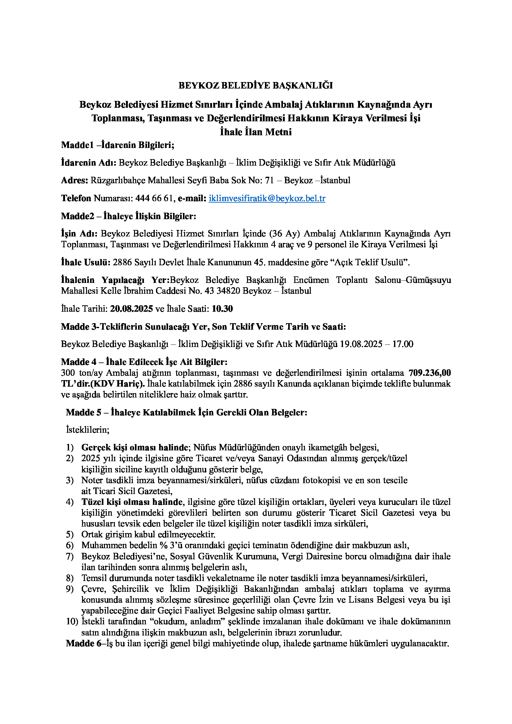 AMBALAJ ATIKLARININ KAYNAĞINDA AYRI TOPLANMASI, TAŞINMASI VE DEĞERLENDİRİLMESİ HAKKININ KİRAYA VERİLMESİ İŞİ