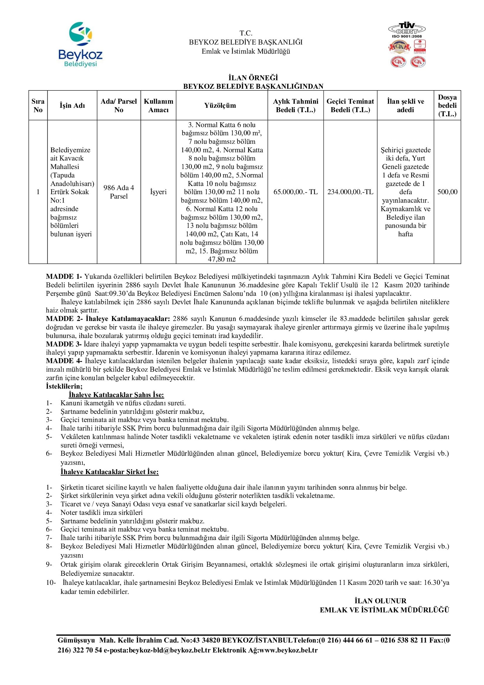 ANADOLUHİSARI 986 ADA 4 PARSELDE BULUNAN BAĞIMSIZ BÖLÜMLERİN KİRALANMASI İŞİ