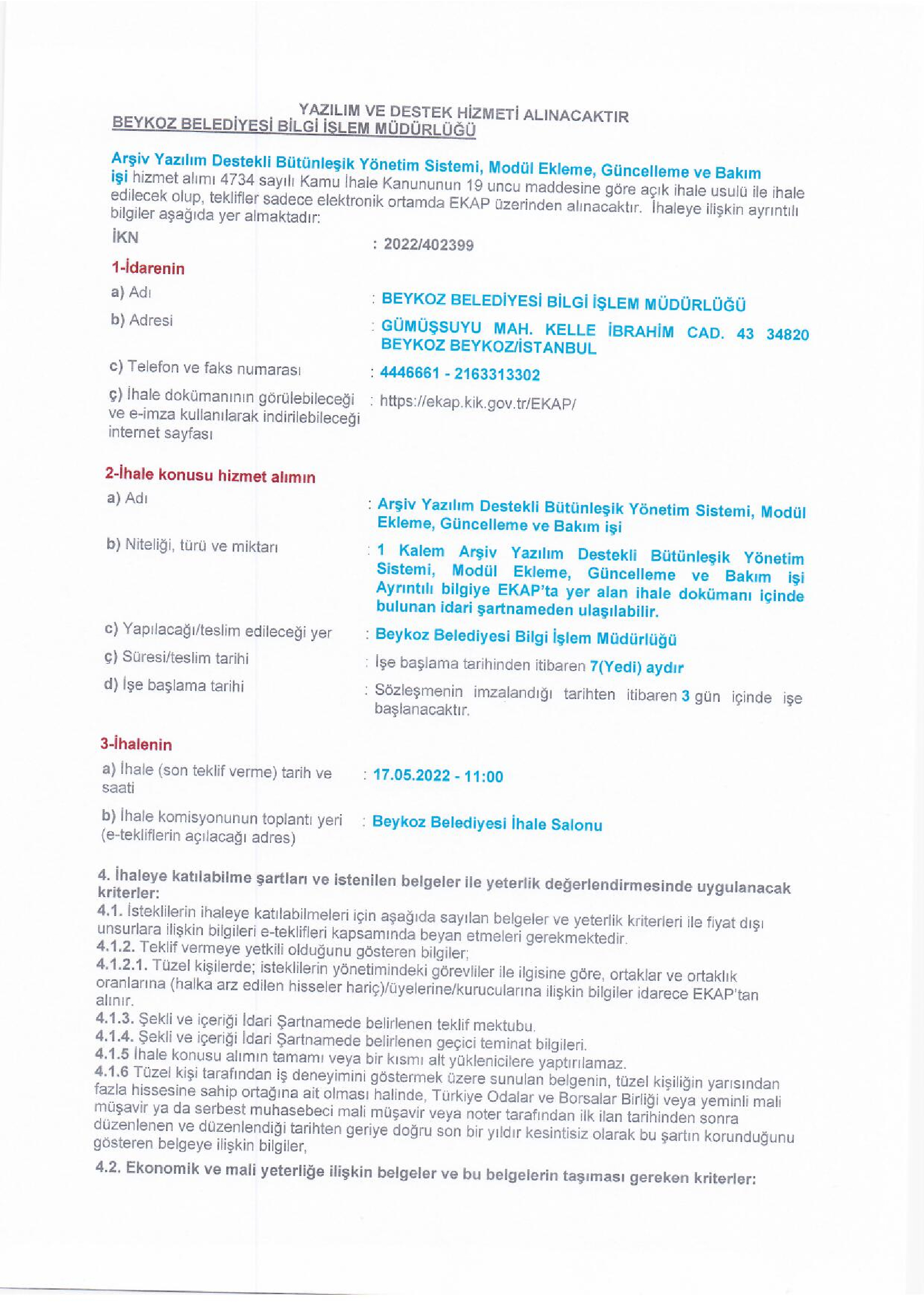ARŞİV YAZILIM DESTEKLİ BÜTÜNLEŞİK YÖNETİM SİSTEMİ, MODÜL EKLEME, GÜNCELLEME VE BAKIM İŞİ