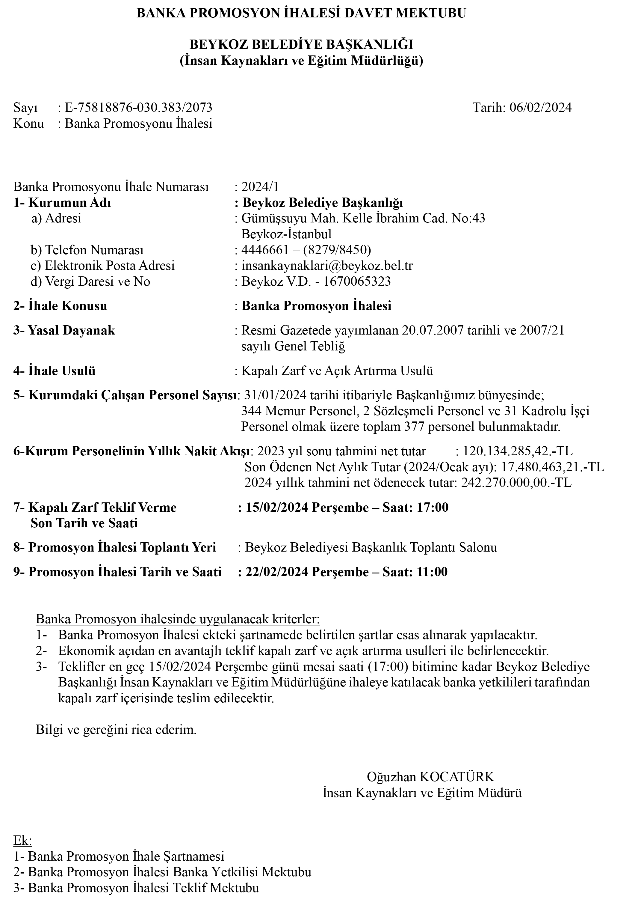 BEYKOZ BELEDİYE BAŞKANLIĞI BANKA PROMOSYON İHALESİ DUYURUSU