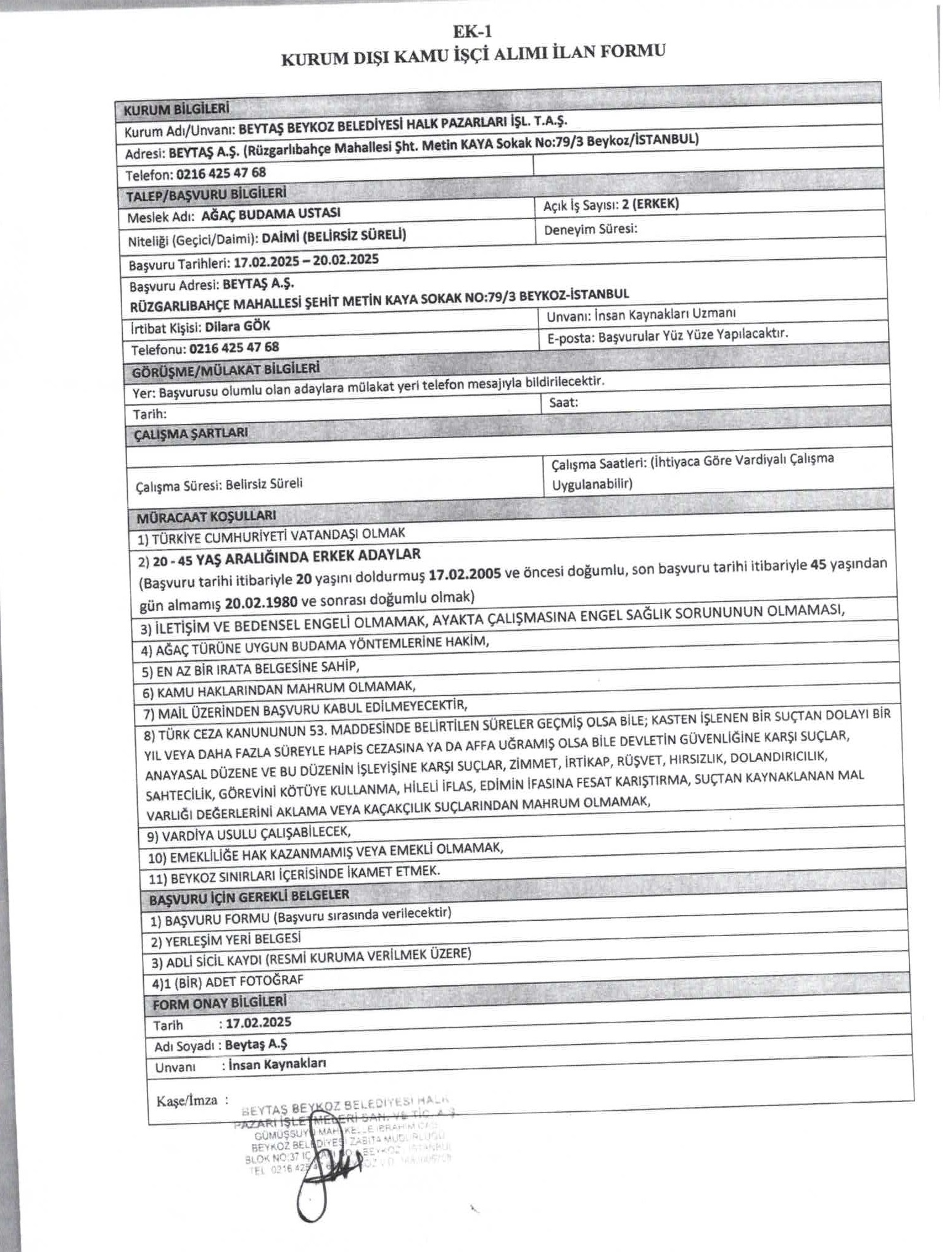 Beytaş A.Ş. Personel Alım Duyurusu (AĞAÇ BUDAMA USTASI)