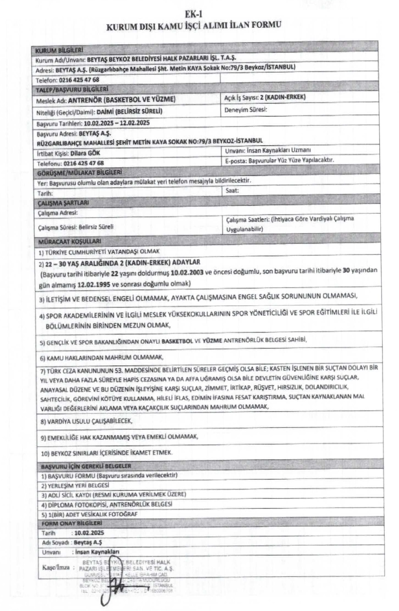 Beytaş A.Ş. Personel Alım Duyurusu (ANTRENÖR - BASKETBOL VE YÜZME)