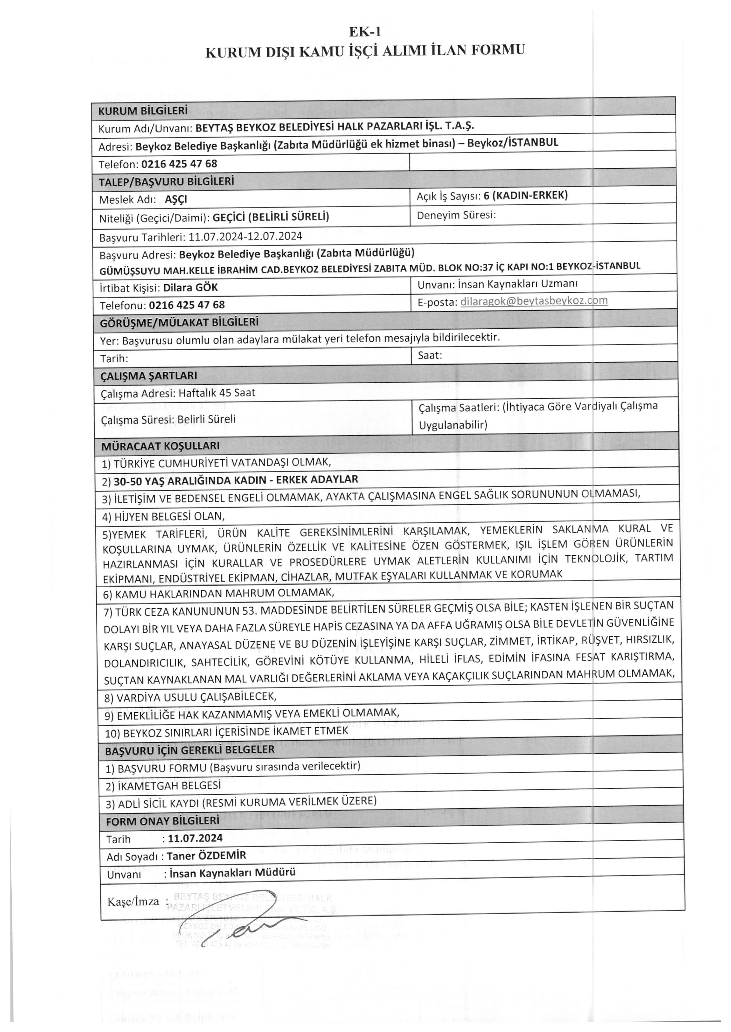 BEYTAŞ A.Ş. PERSONEL ALIM DUYURUSU (Aşçı - Geçici (Belirli Süreli))
