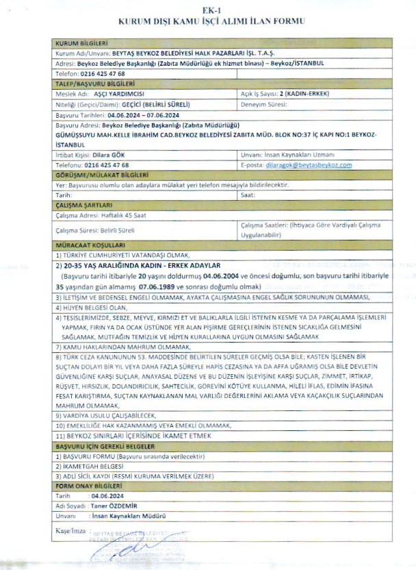 BEYTAŞ A.Ş. PERSONEL ALIM DUYURUSU (AŞÇI YARDIMCISI)
