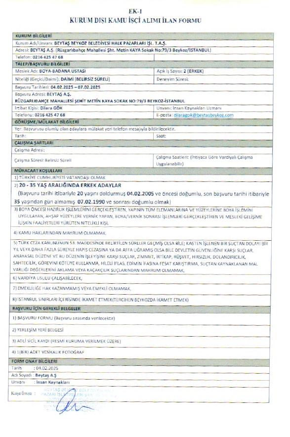 Beytaş A.Ş. Personel Alım Duyurusu (BOYA - BADANA USTASI)