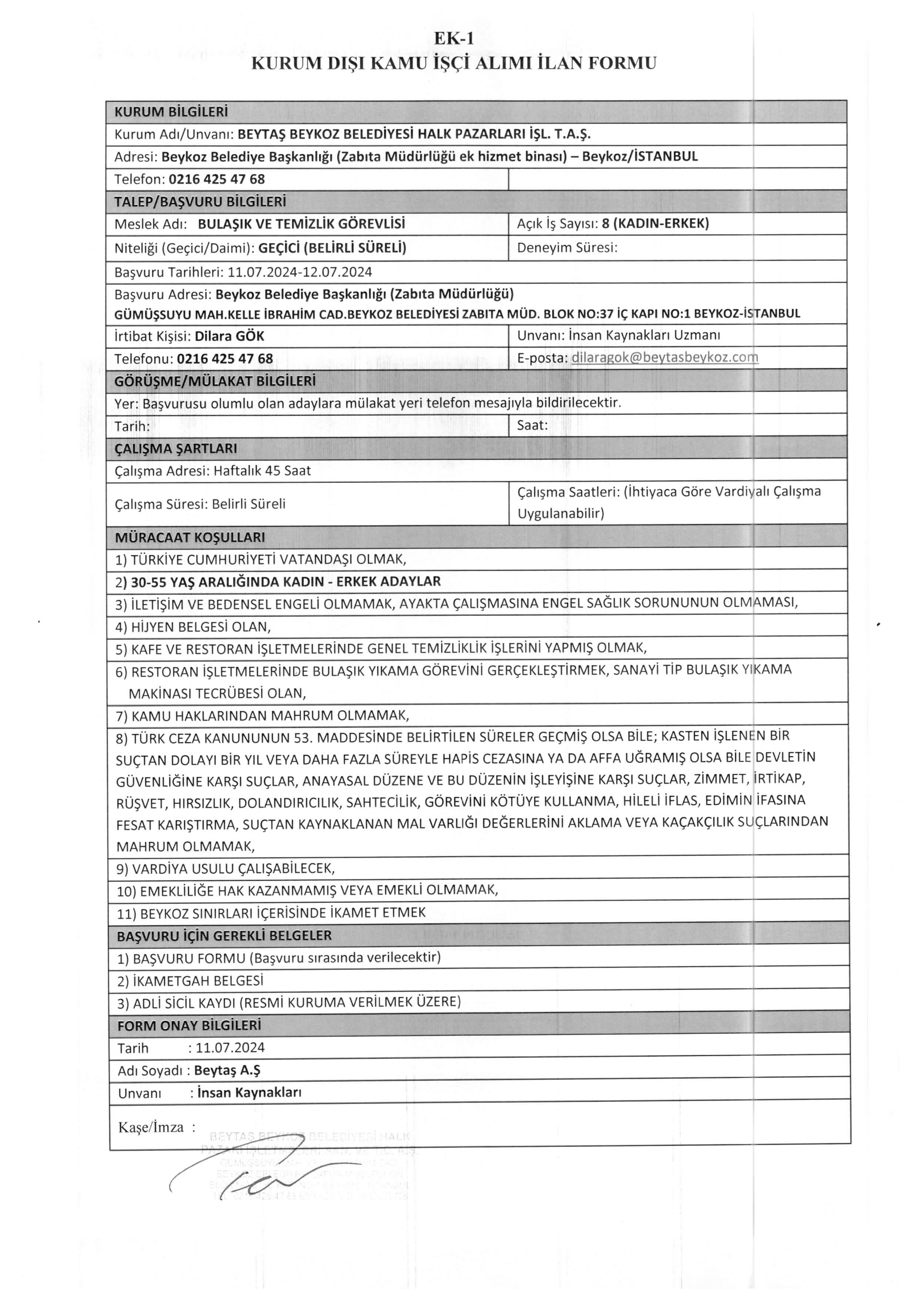 BEYTAŞ A.Ş. PERSONEL ALIM DUYURUSU (Bulaşık ve Temizlik Görevlisi - Geçici (Belirli Süreli))