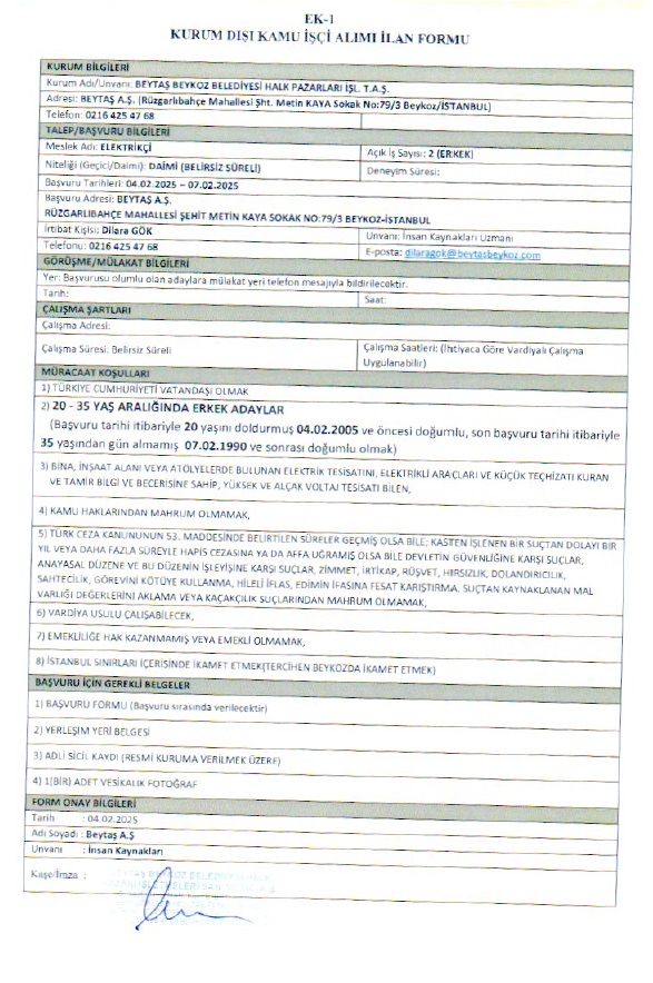 Beytaş A.Ş. Personel Alım Duyurusu (ELEKTRİKÇİ)
