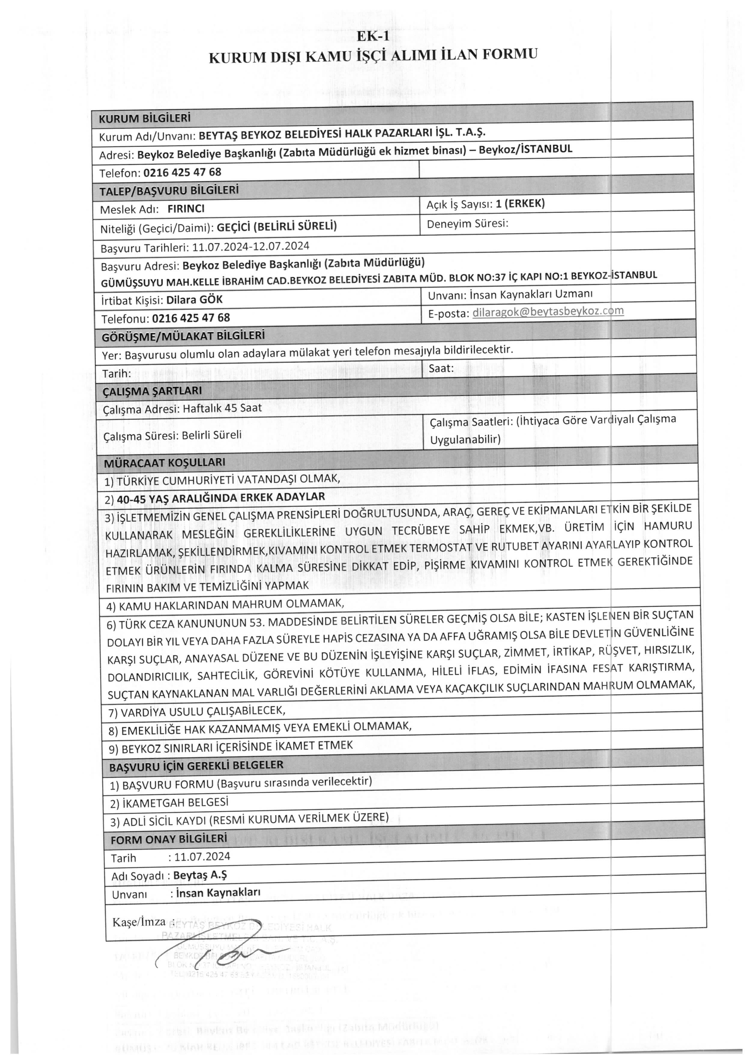 BEYTAŞ A.Ş. PERSONEL ALIM DUYURUSU (Fırıncı - Geçici (Belirli Süreli))