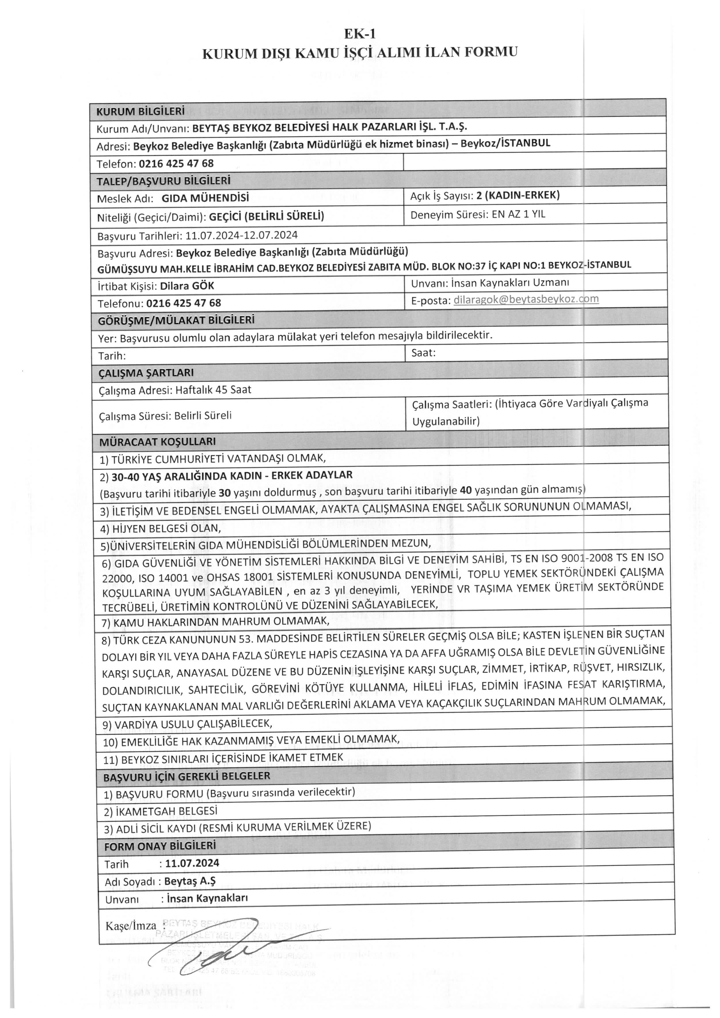 BEYTAŞ A.Ş. PERSONEL ALIM DUYURUSU (Gıda Mühendisi - Geçici (Belirli Süreli))