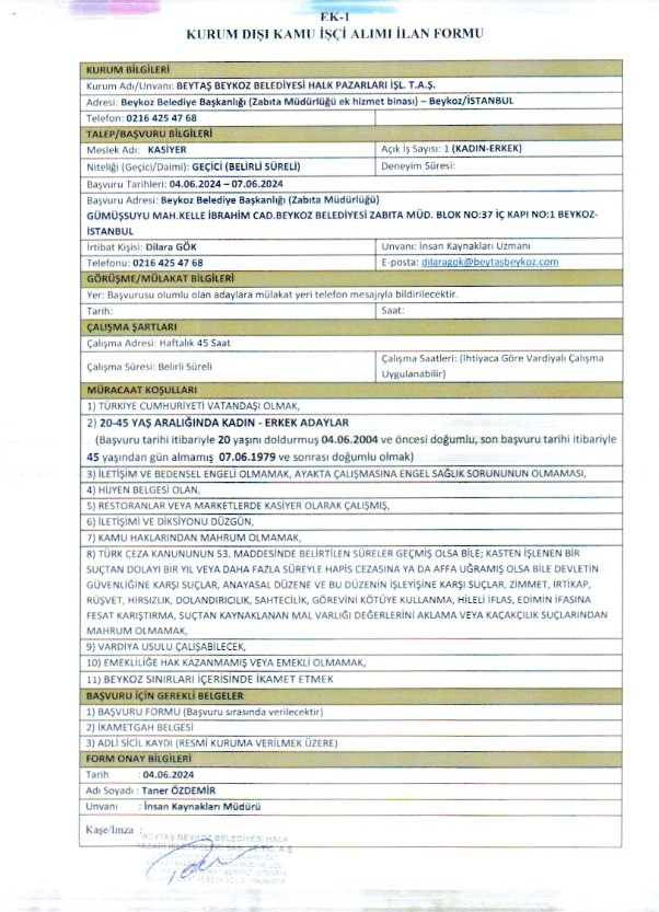 BEYTAŞ A.Ş. PERSONEL ALIM DUYURUSU (KASİYER)