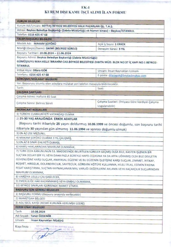BEYTAŞ A.Ş. PERSONEL ALIM DUYURUSU (MAKAM ŞOFÖRÜ)