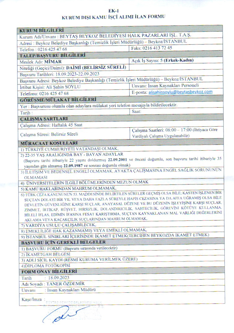 BEYTAŞ A.Ş. PERSONEL ALIM DUYURUSU (MİMAR)