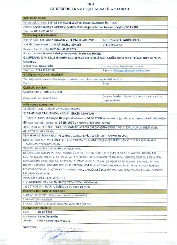 BEYTAŞ A.Ş. PERSONEL ALIM DUYURUSU (RESTORAN BULAŞIK VE TEMİZLİK GÖREVLİSİ)