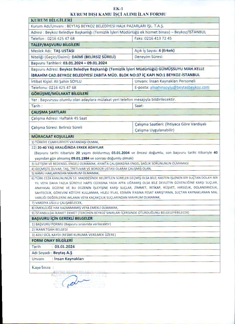 Beytaş A.Ş. Personel Alım Duyurusu (TAŞ USTASI)