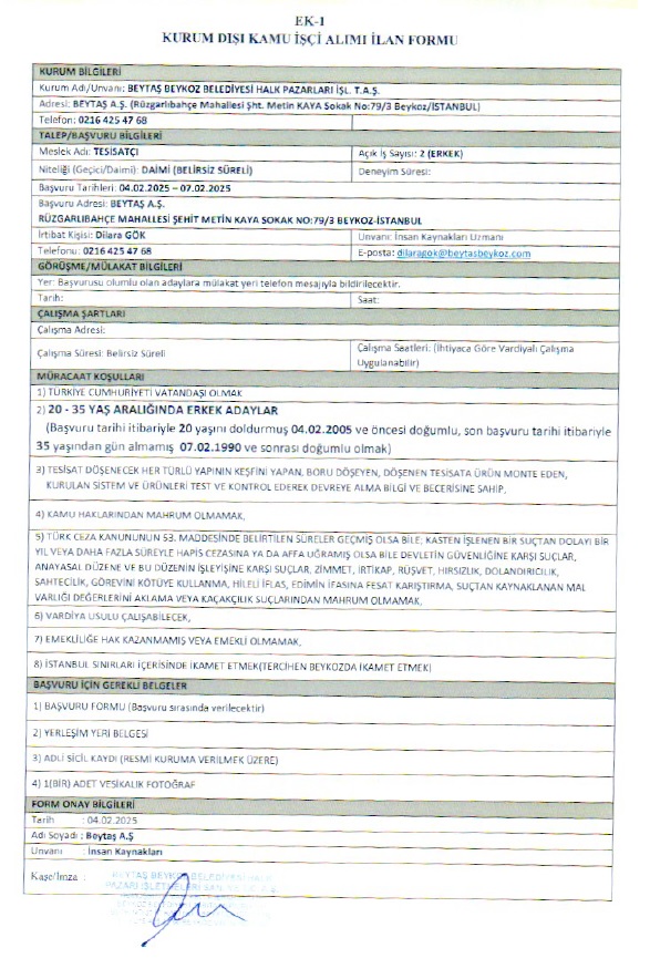 Beytaş A.Ş. Personel Alım Duyurusu (TESİSATÇI)