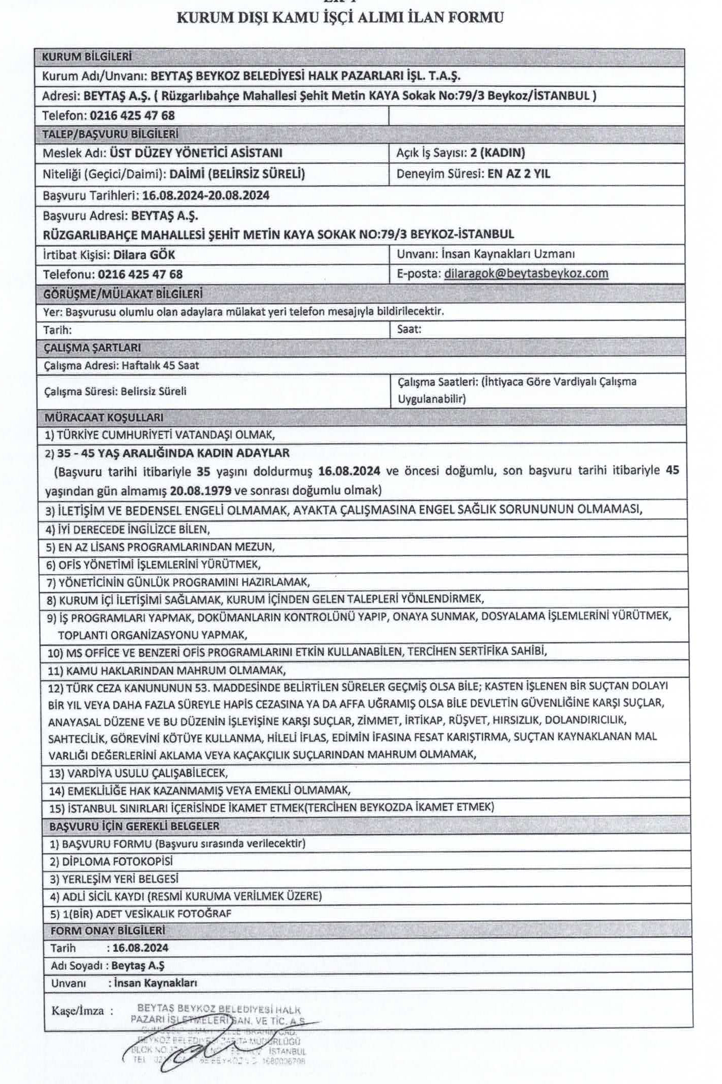 Beytaş A.Ş. Personel Alım Duyurusu (ÜST DÜZEY YÖNETİCİ ASİSTANI)