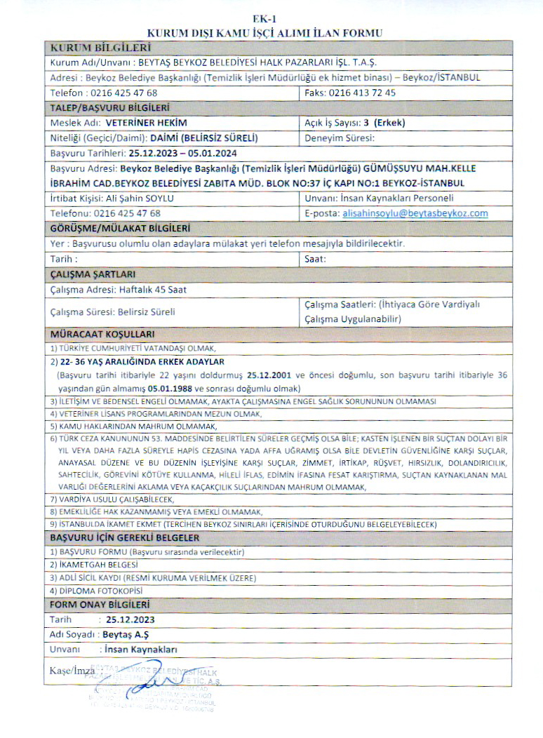 Beytaş A.Ş. Personel Alım Duyurusu (VETERİNER HEKİM)