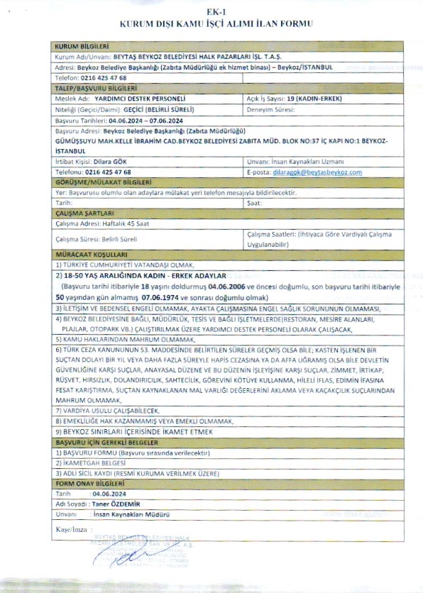 BEYTAŞ A.Ş. PERSONEL ALIM DUYURUSU (YARDIMCI DESTEK PERSONELİ)