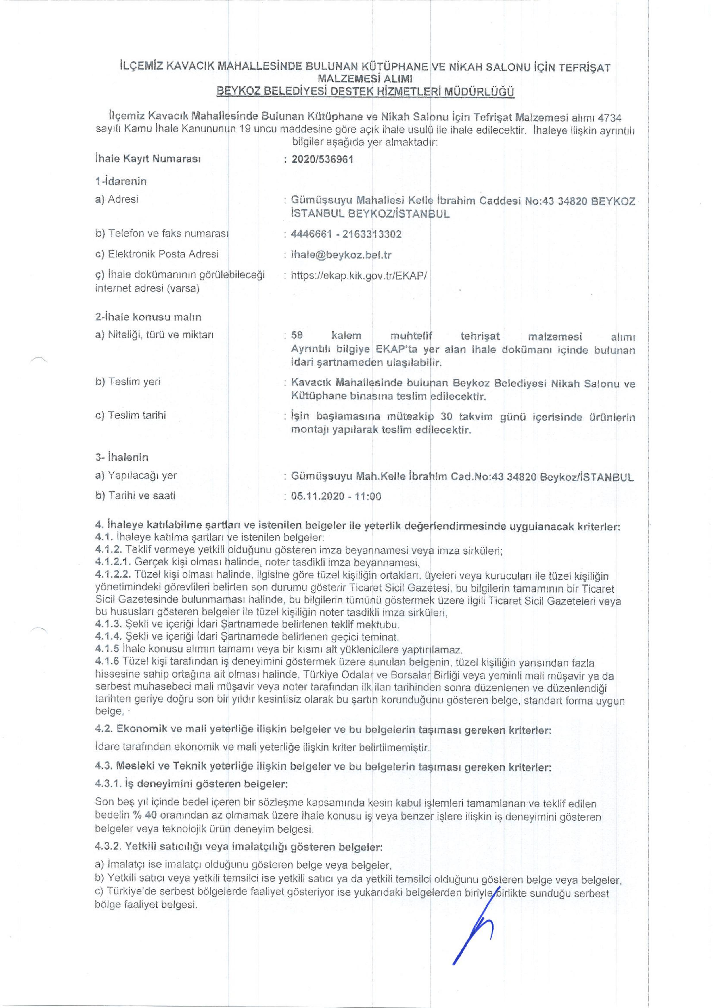 İLÇEMİZ KAVACIK MAHALLESİNDE BULUNAN KÜTÜPHANE VE NİKAH SALONU İÇİN TEFRİŞAT MALZEMESİ ALIMI