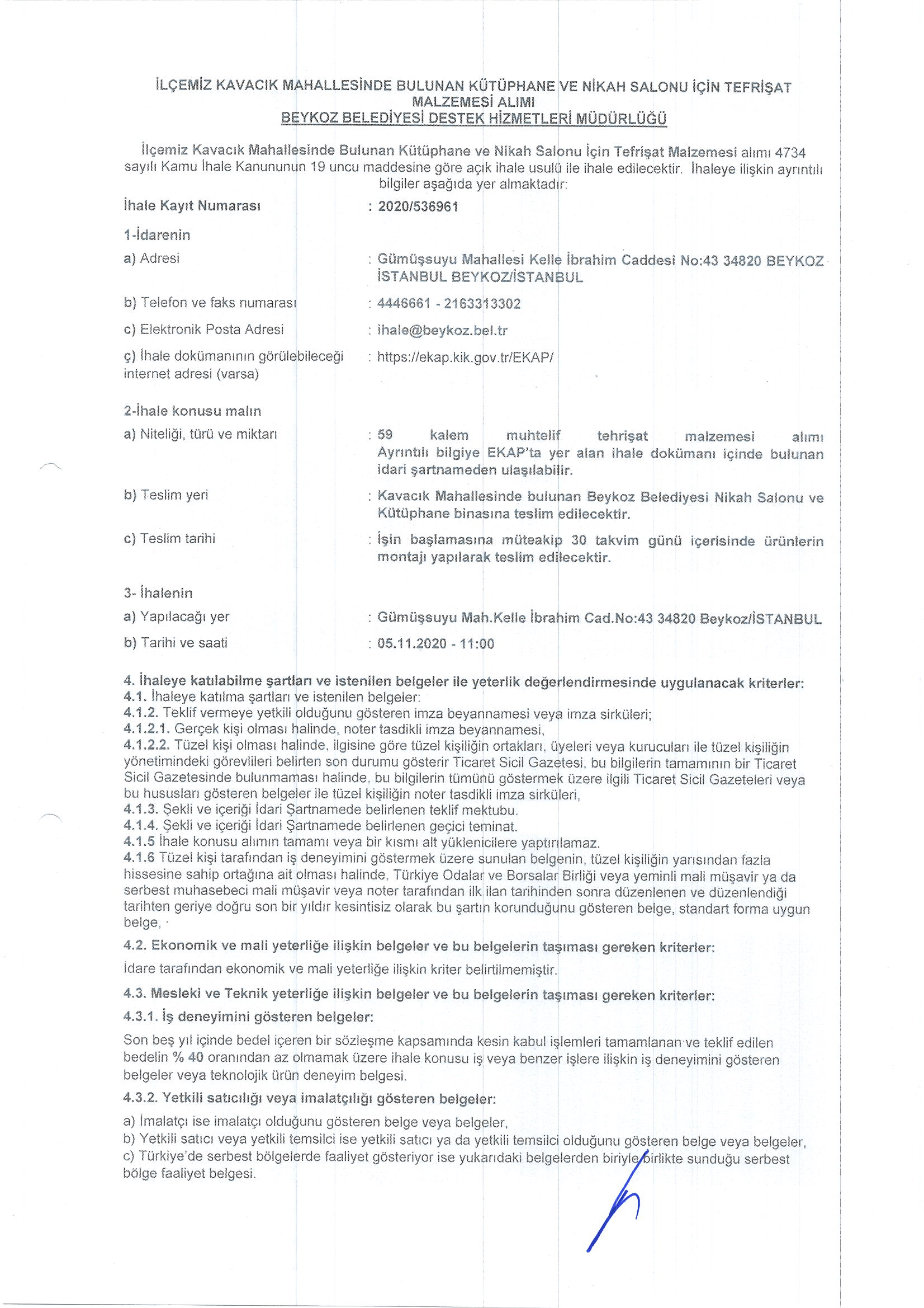 KAVACIK MAHALLESİ'NDE BULUNAN KÜTÜPHANE VE NİKAH SALONU İÇİN TEFRİŞAT MALZEMESİ ALIMI