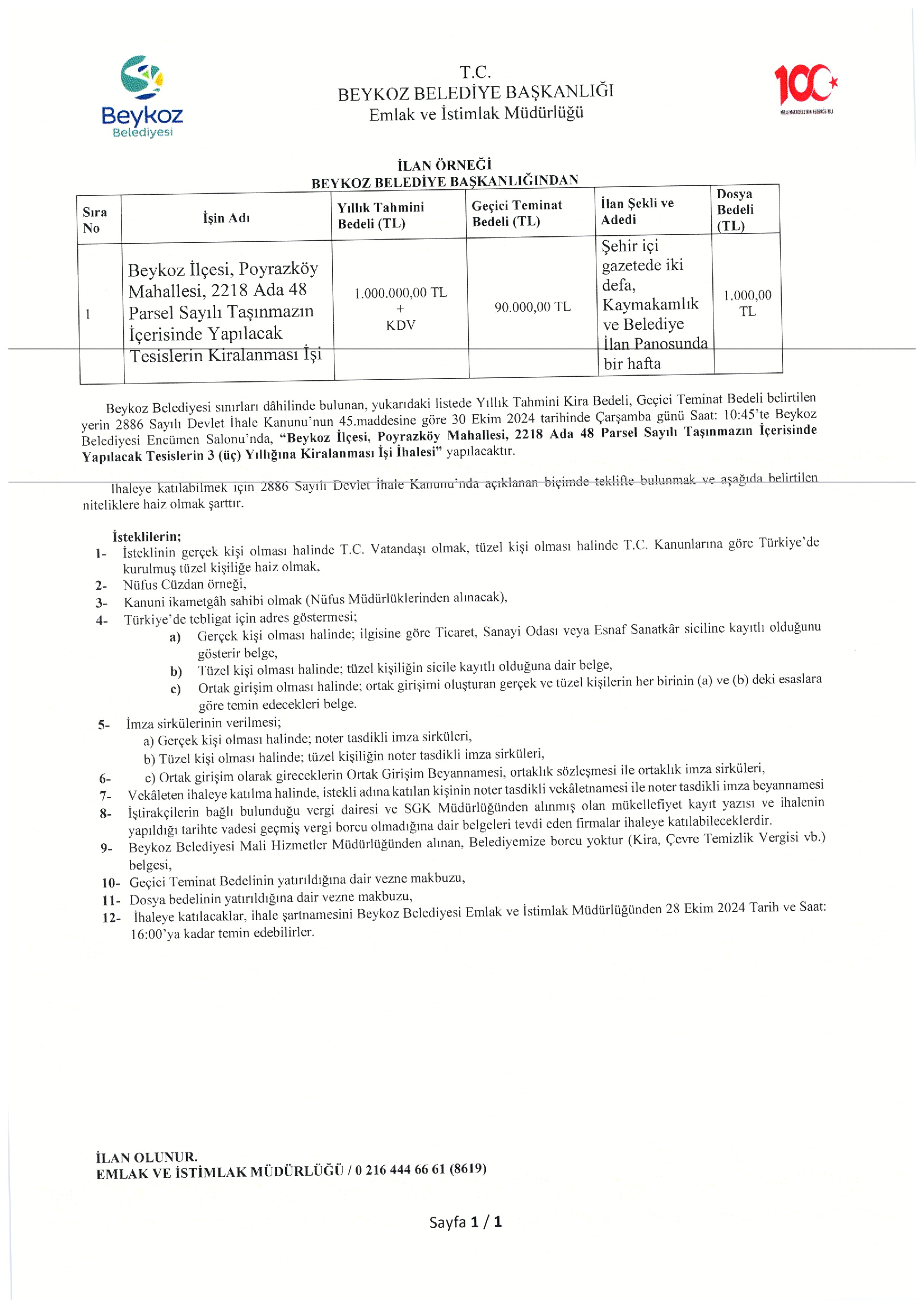 POYRAZKÖY MAHALLESİ TAŞINMAZ KİRALAMA İŞİ