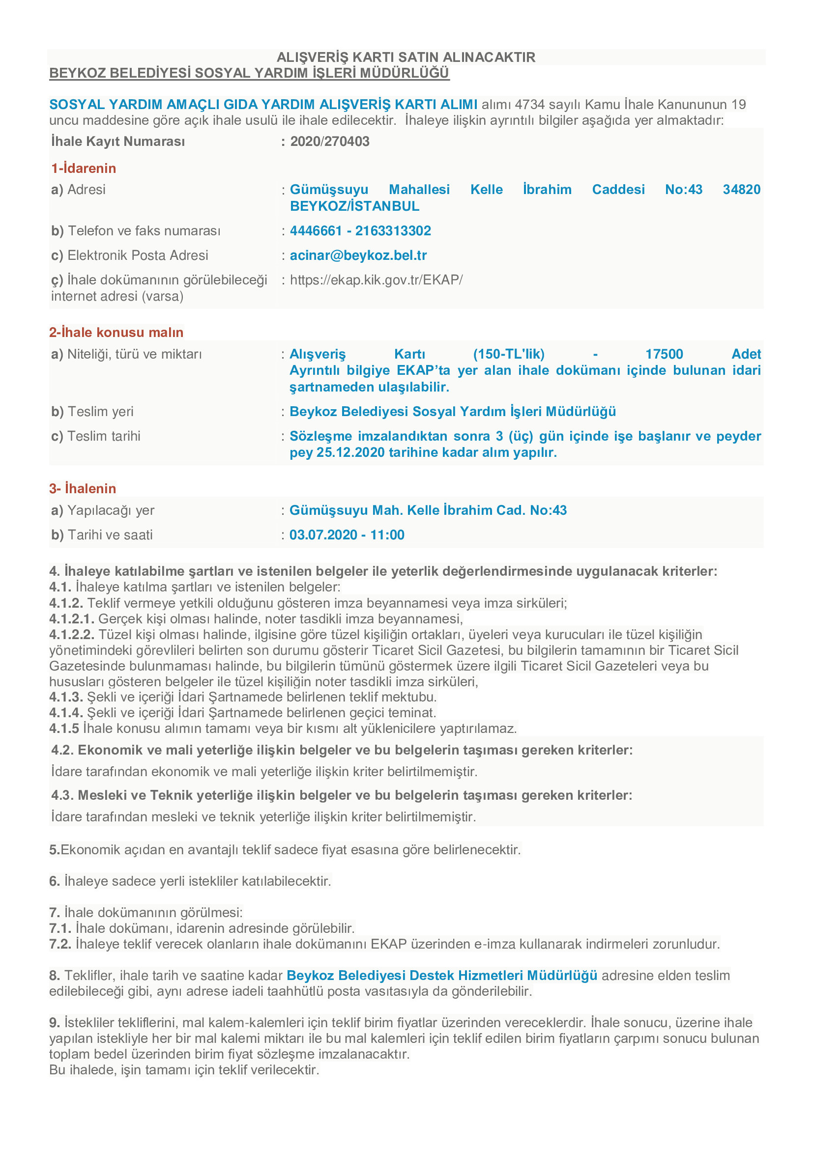 SOSYAL YARDIM AMAÇLI GIDA YARDIM ALIŞVERİŞ KARTI ALIMI