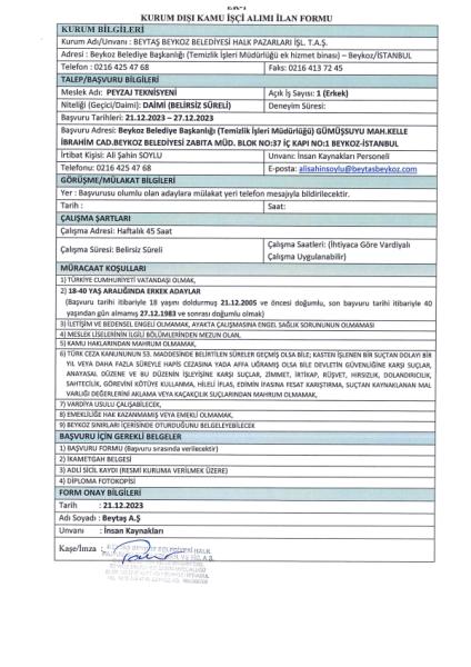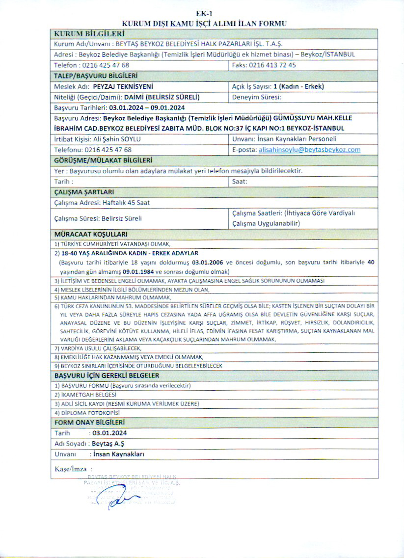 Beytaş A.Ş. Personel Alım Duyurusu (PEYZAJ TEKNİSYENİ)