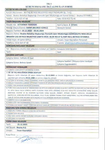 Beytaş A.Ş. Personel Alım Duyurusu (VETERİNER TEKNİKERİ)