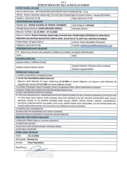 Beytaş A.Ş. Personel Alım Duyurusu (BAHÇE SULAMA VE TESİSAT TEKNİKERİ)