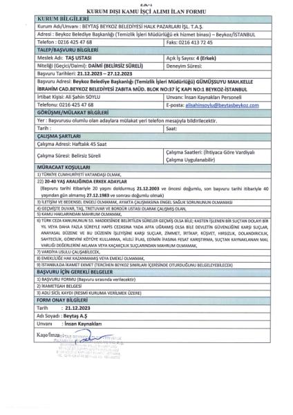 Beytaş A.Ş. Personel Alım Duyurusu (TAŞ USTASI)