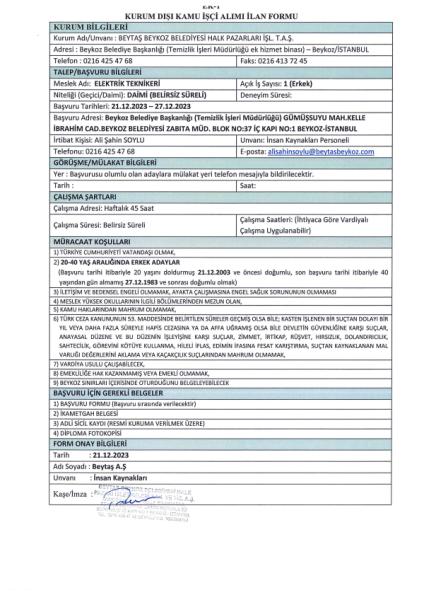Beytaş A.Ş. Personel Alım Duyurusu (ELEKTRİK TEKNİKERİ)