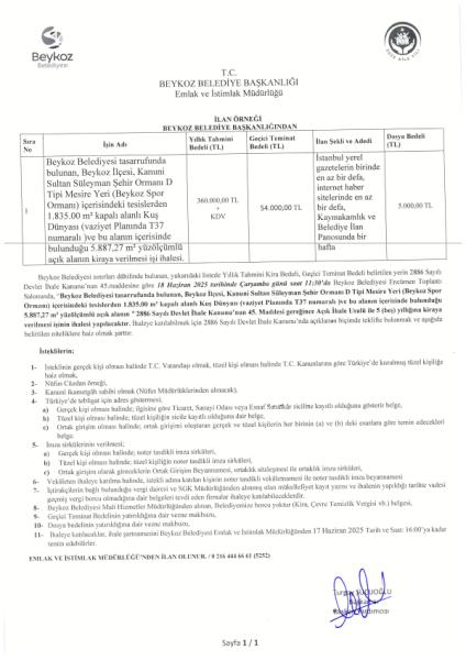 BEYKOZ SPOR ORMANI KUŞ DÜNYASI KİRALAMA İŞİ