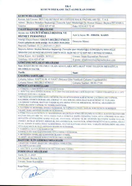 BEYTAŞ A.Ş. PERSONEL ALIM DUYURUSU (Geçici Süreli Destek ve Hizmet Personeli)