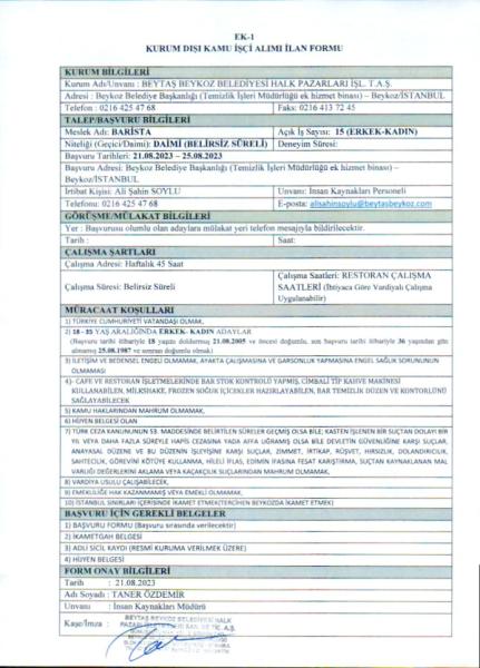 BEYTAŞ A.Ş. Personel Alım İlanı Duyurusu (Garson)