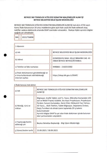 BEYKOZ 360 TEKNOLOJİLERİ ATÖLYESİ DONATIM MALZEMELERİ ALIMI