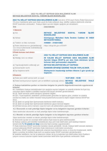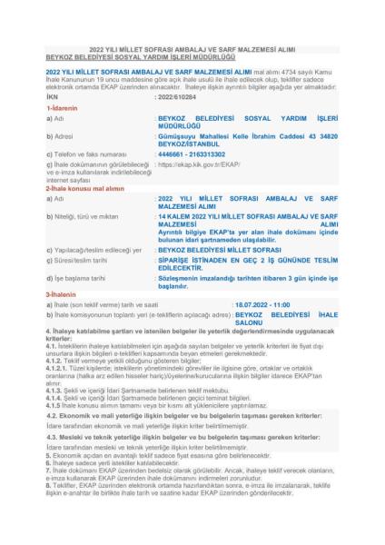 MİLLET SOFRASI AMBALAJ VE SARF MALZEMESİ ALIMI