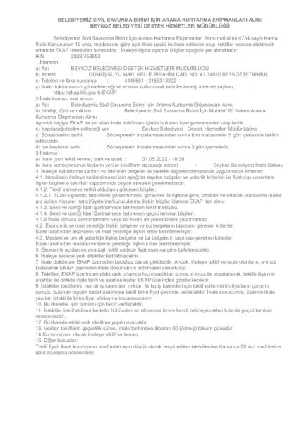 SİVİL SAVUNMA BİRİMİ İÇİN ARAMA KURTARMA EKİPMANLARI ALIMI