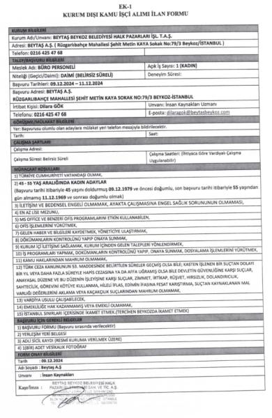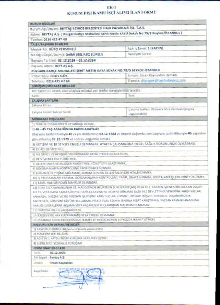 Beytaş A.Ş. Personel Alım Duyurusu (BÜRO PERSONELİ)