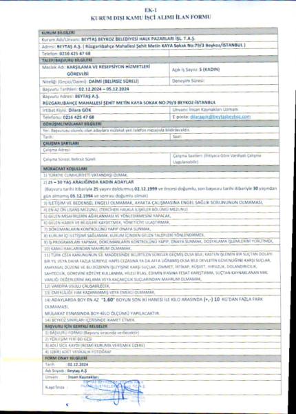 Beytaş A.Ş. Personel Alım Duyurusu (KARŞILAMA VE RESEPSİYON HİZMETLERİ GÖREVLİSİ)