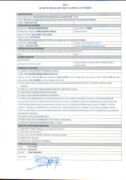 Beytaş A.Ş. Personel Alım Duyurusu (TURİZM KOORDİNATÖRÜ)