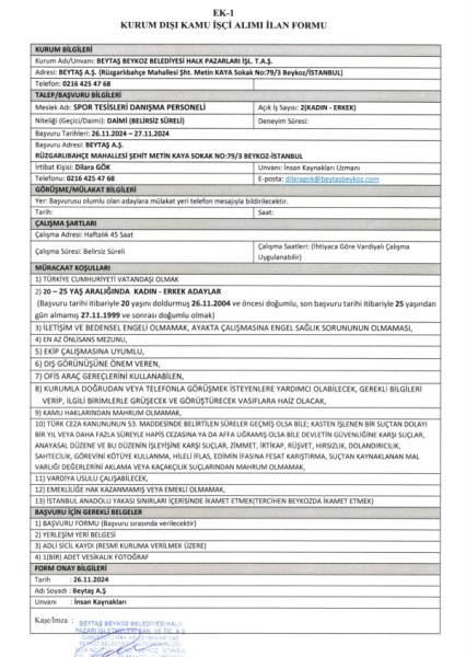 Beytaş A.Ş. Personel Alım Duyurusu (SPOR TESİSLERİ DANIŞMA PERSONELİ)