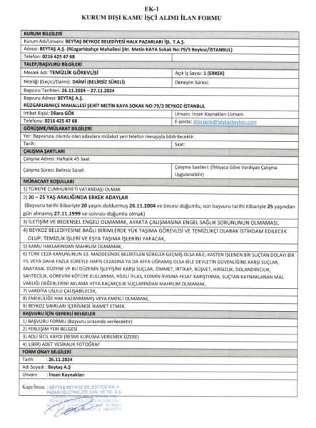 Beytaş A.Ş. Personel Alım Duyurusu (TEMİZLİK GÖREVLİSİ)